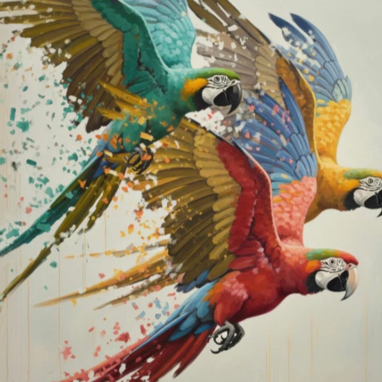 Mint by Michelle - Uncaged Parrot Decoupage Paper A highly coloured vertical designed image of 3 macaw parrots pixelated at the edges This print...