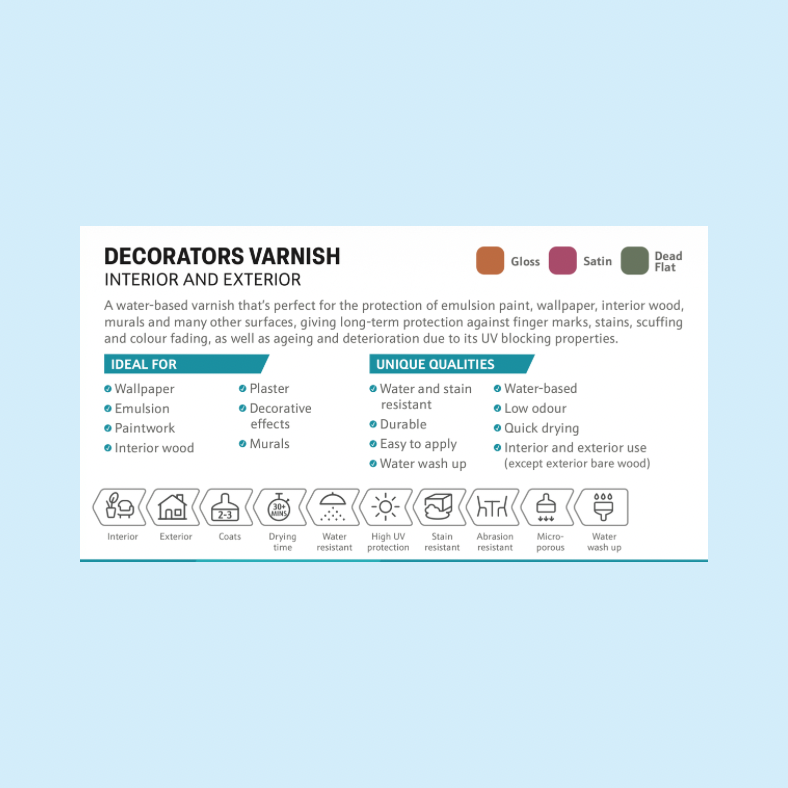 Polyvine Decorators Varnish Gloss Finish A water based top coat varnish for protecting decorative surfaces including paint and wall paper. ...