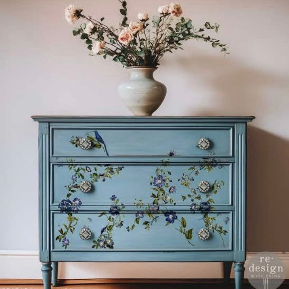 Transform your furniture and home decor with this elegant blue floral transfer featuring delicate vines, sprigs, and a charming blue bird. Perfect for adding a touch of nature-inspired beauty to your upcycling projects.