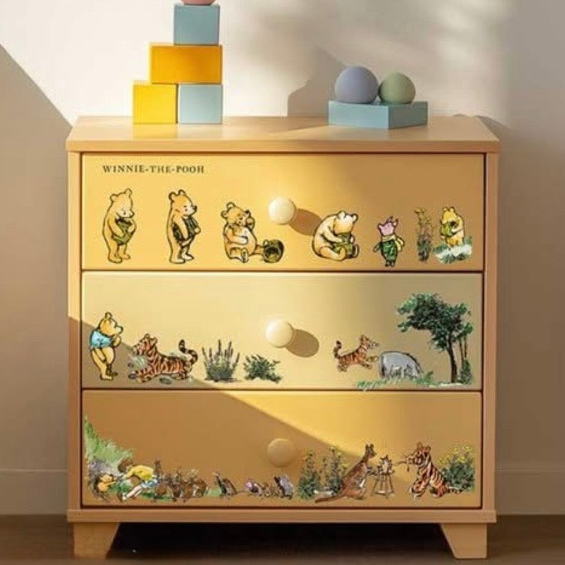 Bring nostalgic woodland charm to your furniture and home decor with this adorable bear and friends transfer. Perfect for nursery furniture, children's rooms, or adding a whimsical touch to any upcycling project.