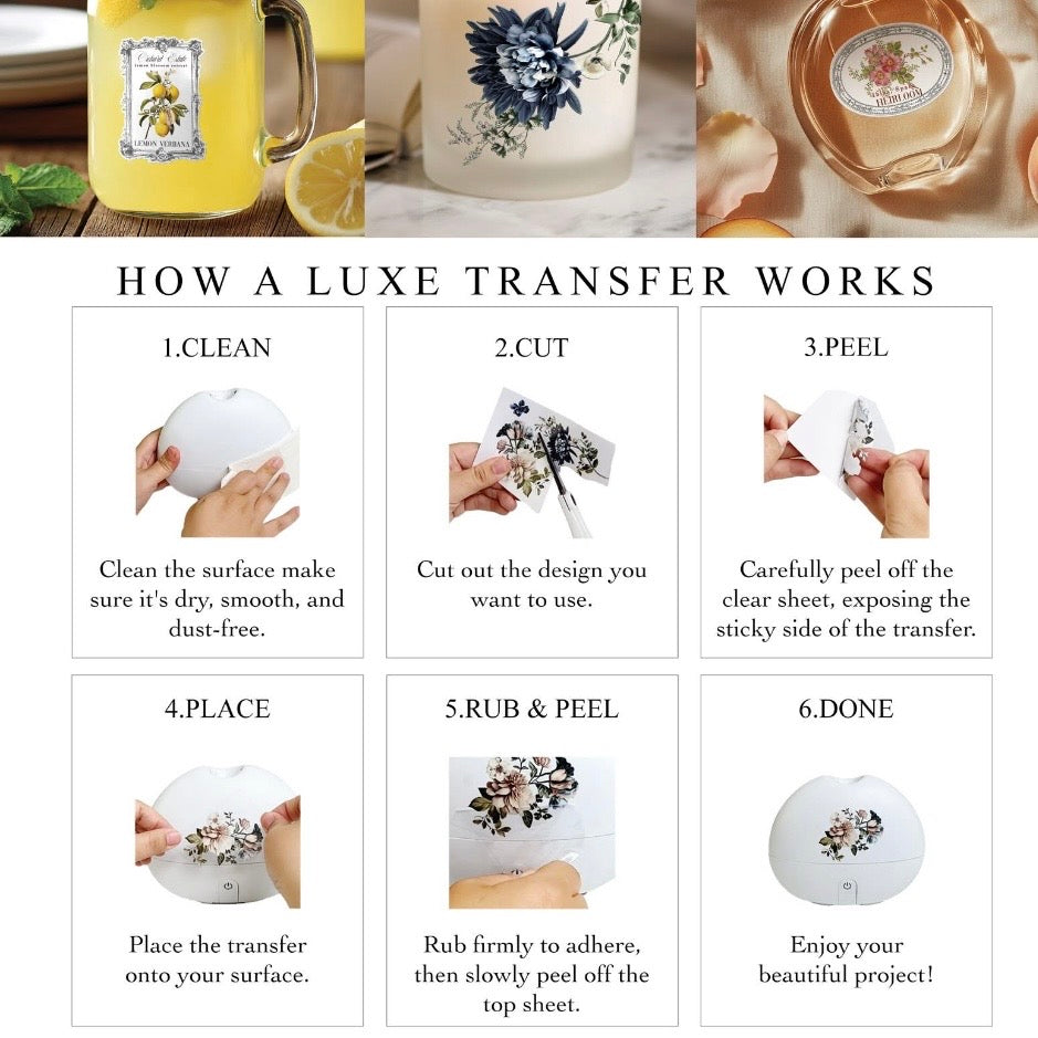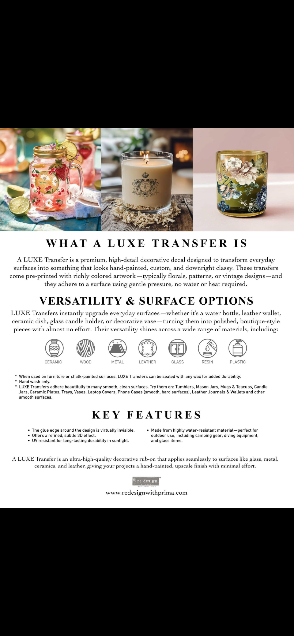 New from Redesign with Prima, Luxe Transfers are premium highly detailed decals which adhere to many surfaces with very little pressure, no water or heat. The glued edge around the design virtually disappears upon application and the transfer will be slightly raised giving a subtle 3D effect.