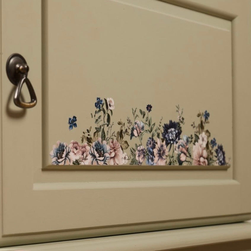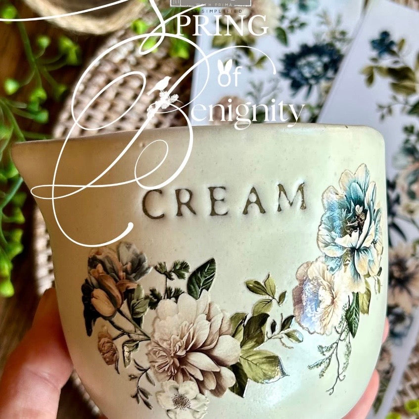 Redesign with Prima Luxe transfer Whispers of Indigo adds florals of deep blues, soft creams, muted blue and lush greenery to your projects.