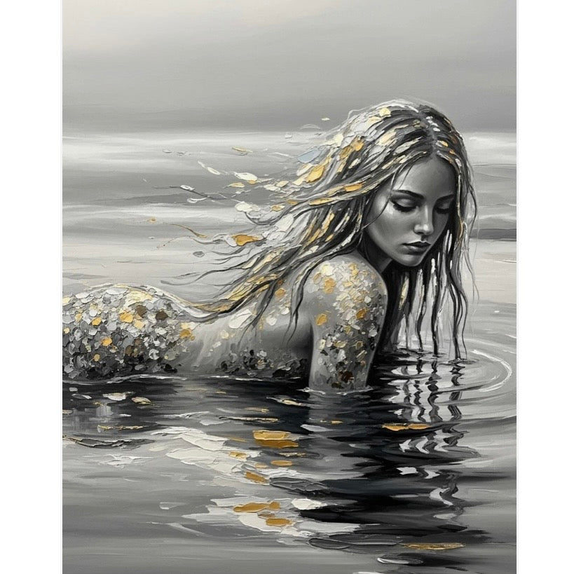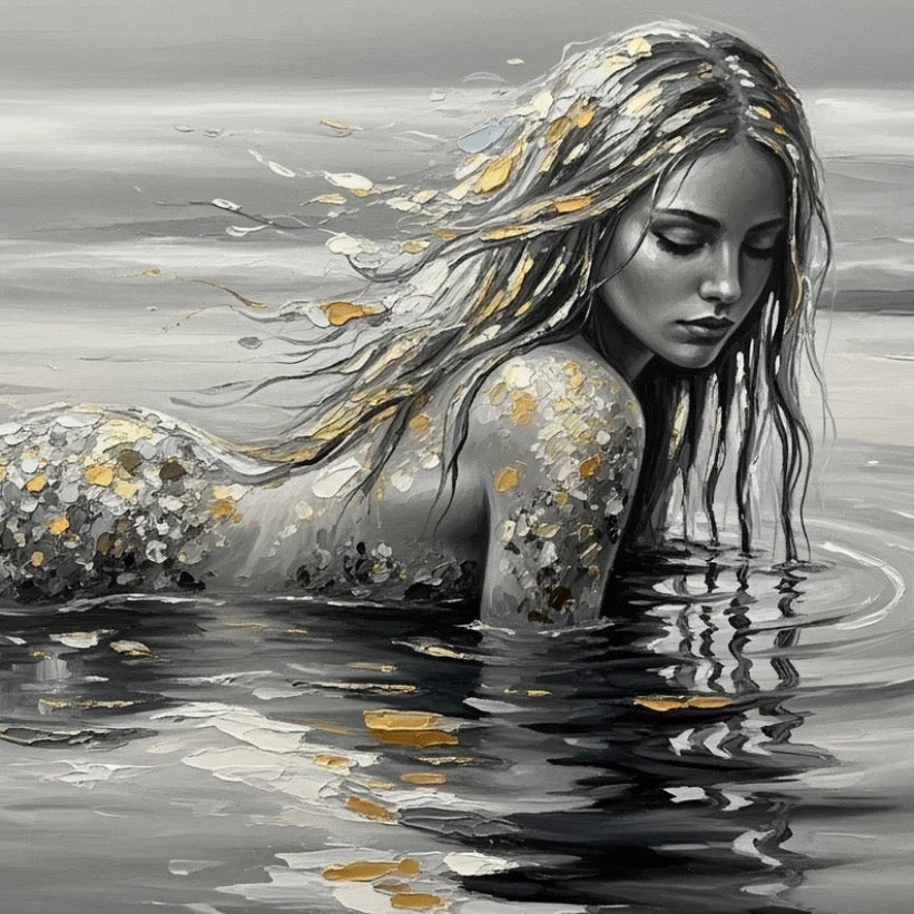Three Yellow Goats Decoupage paper B&W Mermaid is a stunning black and white image of a mermaid with painted yellow highlights